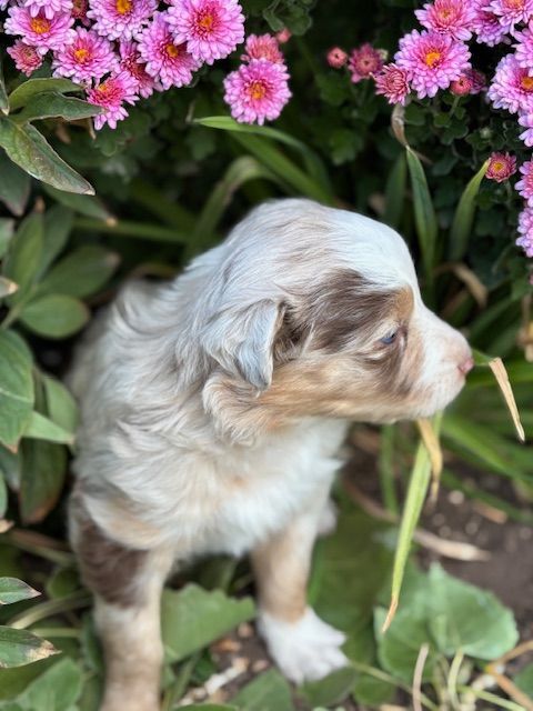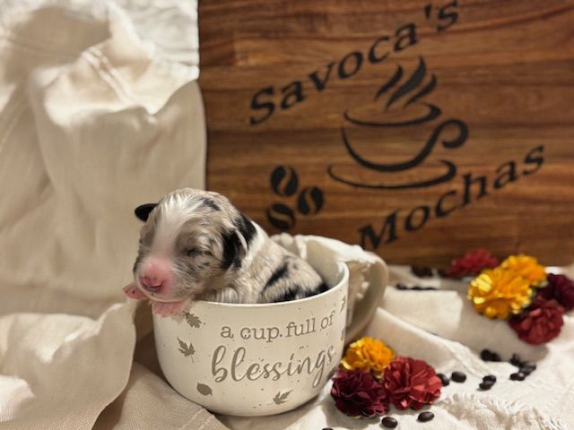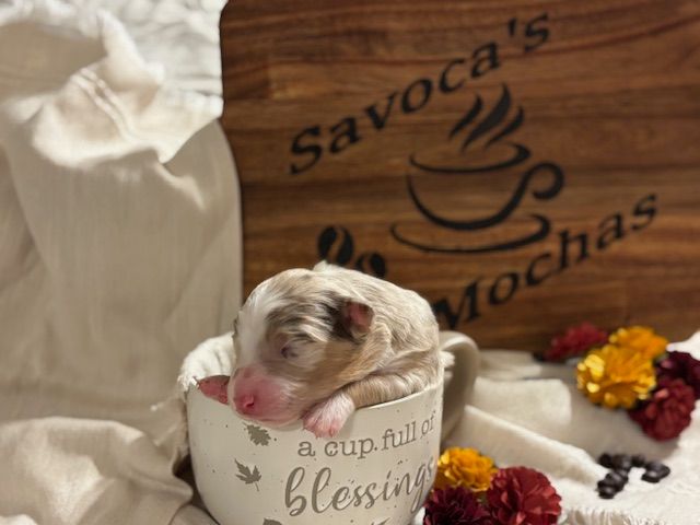 It's been a while since we had a litter of Aussies. Trixie and Spike retired after giving us many litters of beautiful puppies. Their daughter, Raven, has taken over, along with her mate, Jasper. The result is this sweet litter of 5. They have been dubbed our "Coffee" litter, as coffee is a big deal around our house, and is a great theme for Autumn. We hope you enjoy perusing their pictures (More coming as they grow)!